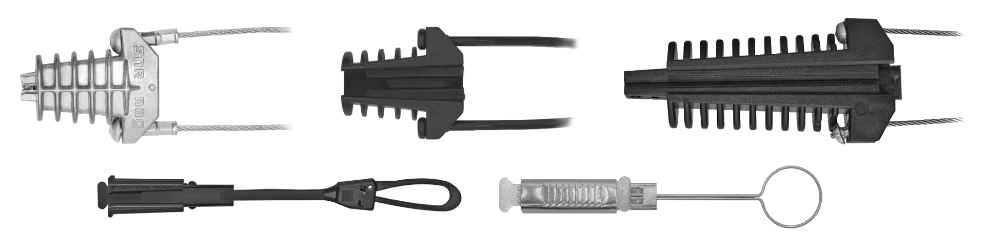 Анкерные зажимы предназначены для крепление кабеля на опорах при воздушной протяжке. Зажимы устанавливаются в начале и конце трассы, на ее поворотах. Кроме того, зажимы могут использоваться в нескольких точках посреди длинного прямолинейного участка, в местах значительной растягивающей нагрузки на кабель, при перепаде высот точек крепления и т.п.