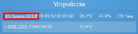 После настройки RS485 для опроса устройств на Главной странице в разделе Устройства будут отображаться основные данные датчиков SNR-RSSensor-H/T/P и подключенных к ним датчиков 1-wire. Для перехода к расширенным настройкам датчика необходимо нажать на ссылку RSSensor-H/T/P.