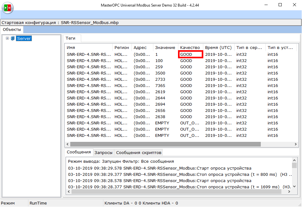 Программа запустит опрос датчика по протоколу Modbus. При исправном состоянии опроса в столбце Качество будет отображаться значение GOOD.